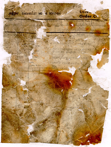 Während der Frame-off Restauration fand ich ein Exemplar der "Order Copy" im linken Längsträger des Rahmens. Ca. 0,5m hinter dem Lenkgetriebe.